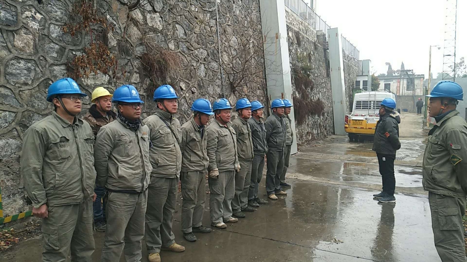 某藥廠變壓器增容改造現(xiàn)場,施工人員頂著寒風(fēng)冒著冷雨召開班前會
